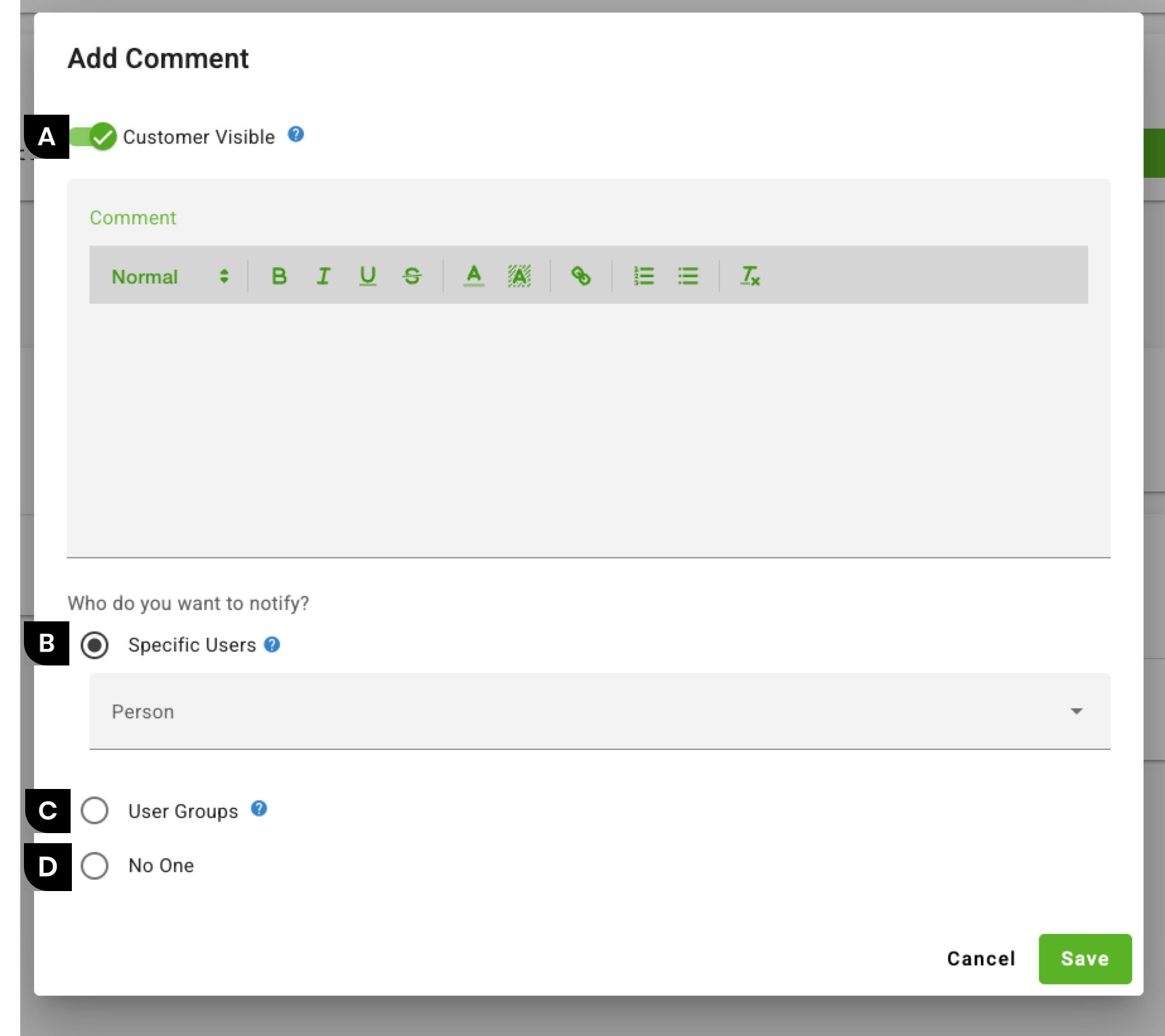 (B) Specific Users, the elected users will be notified of this comment, regardless of notification settings. NOTE: By default, the technician who submitted the request will be selected.