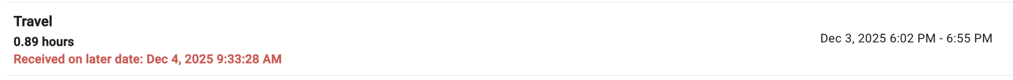 - NOTE: If a labor or travel entry is received on a later day into HQ (i.e. technician was offline) from when it was created, a note in will be shown below the entry. This will indicate the date and time in which the data was actually received.