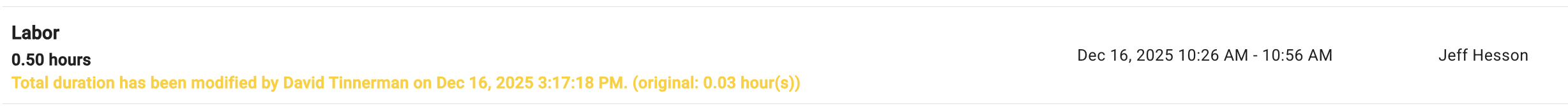 - NOTE: If a labor or travel entry is modified after it has been received by HQ (i.e. technician or office staff), a note in will be shown below the entry. This will indicate the date and time in which the data was modified, by whom, and the original value.