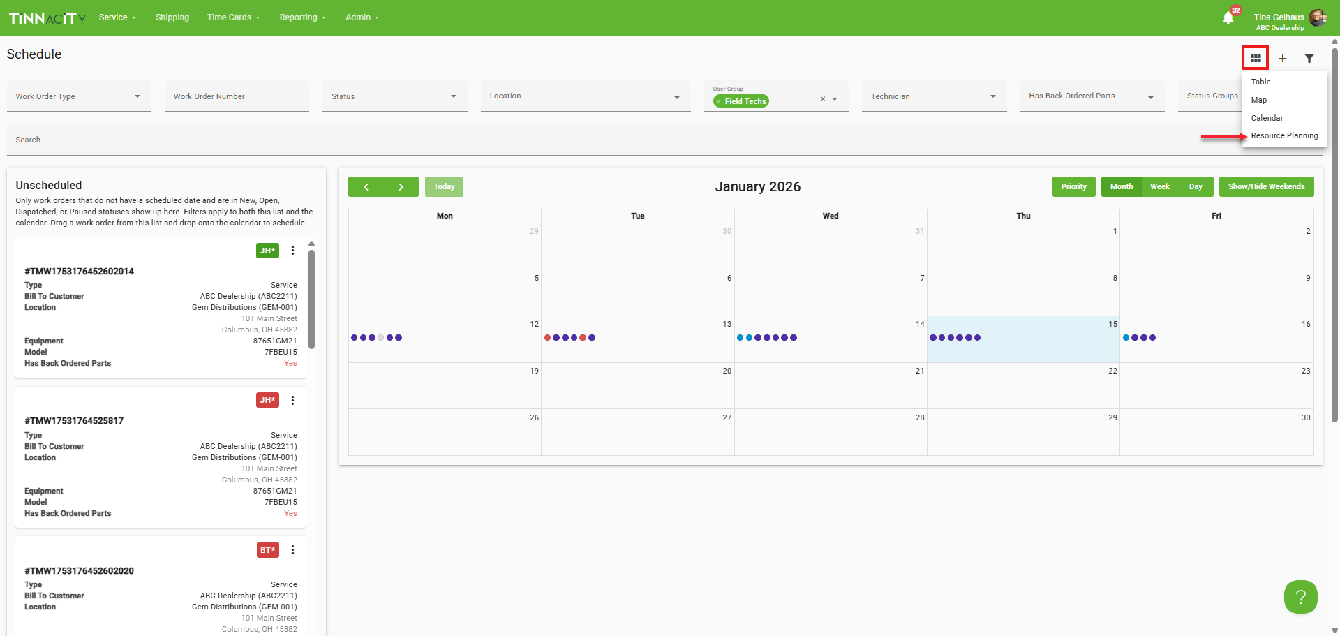 - View Options (Table / Calendar): Switch between a table or calendar view to display scheduling and work order data.