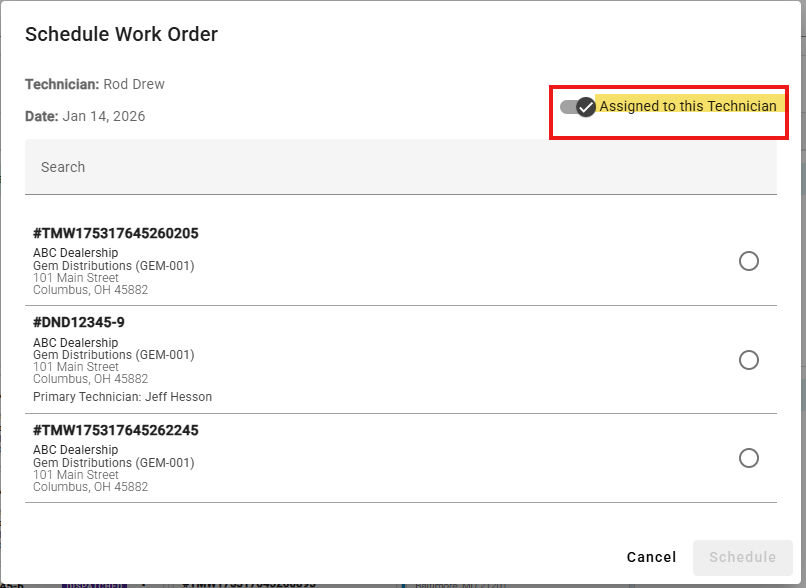 By default, the view only displays work orders currently assigned to the selected technician. TIP: To expand your view and see work orders that are either unassigned or assigned to other members of the team, simply toggle off the "Assigned to this Technician" setting.