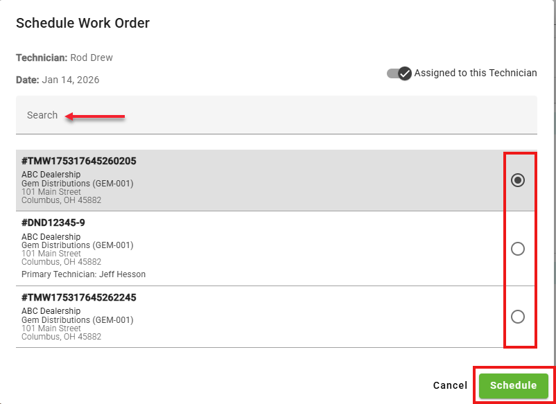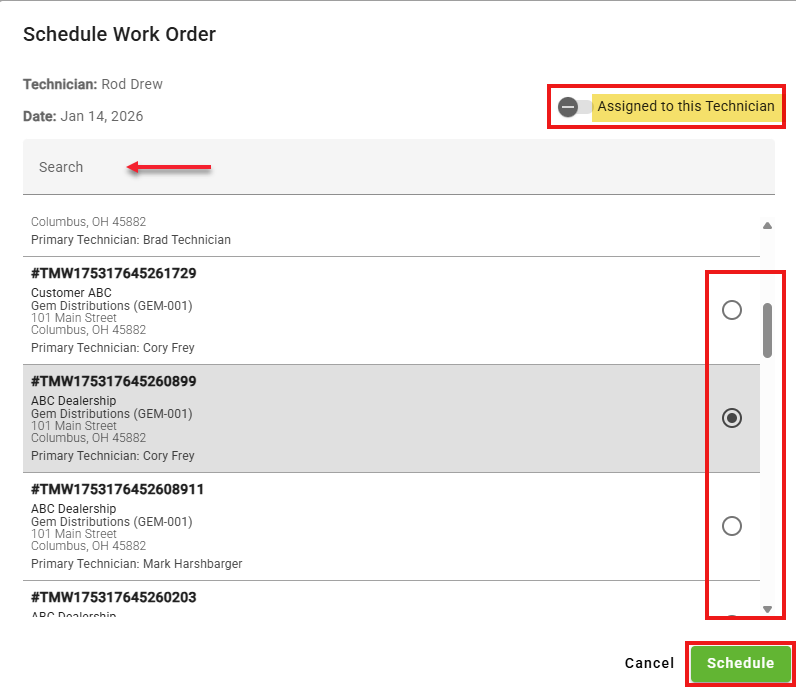 The work orders listed are actively assigned to the selected technician, use the search field to search for a specific work order or scroll through the list to select a work order, then click [Schedule]. Currently only one work order can be selected at a time.