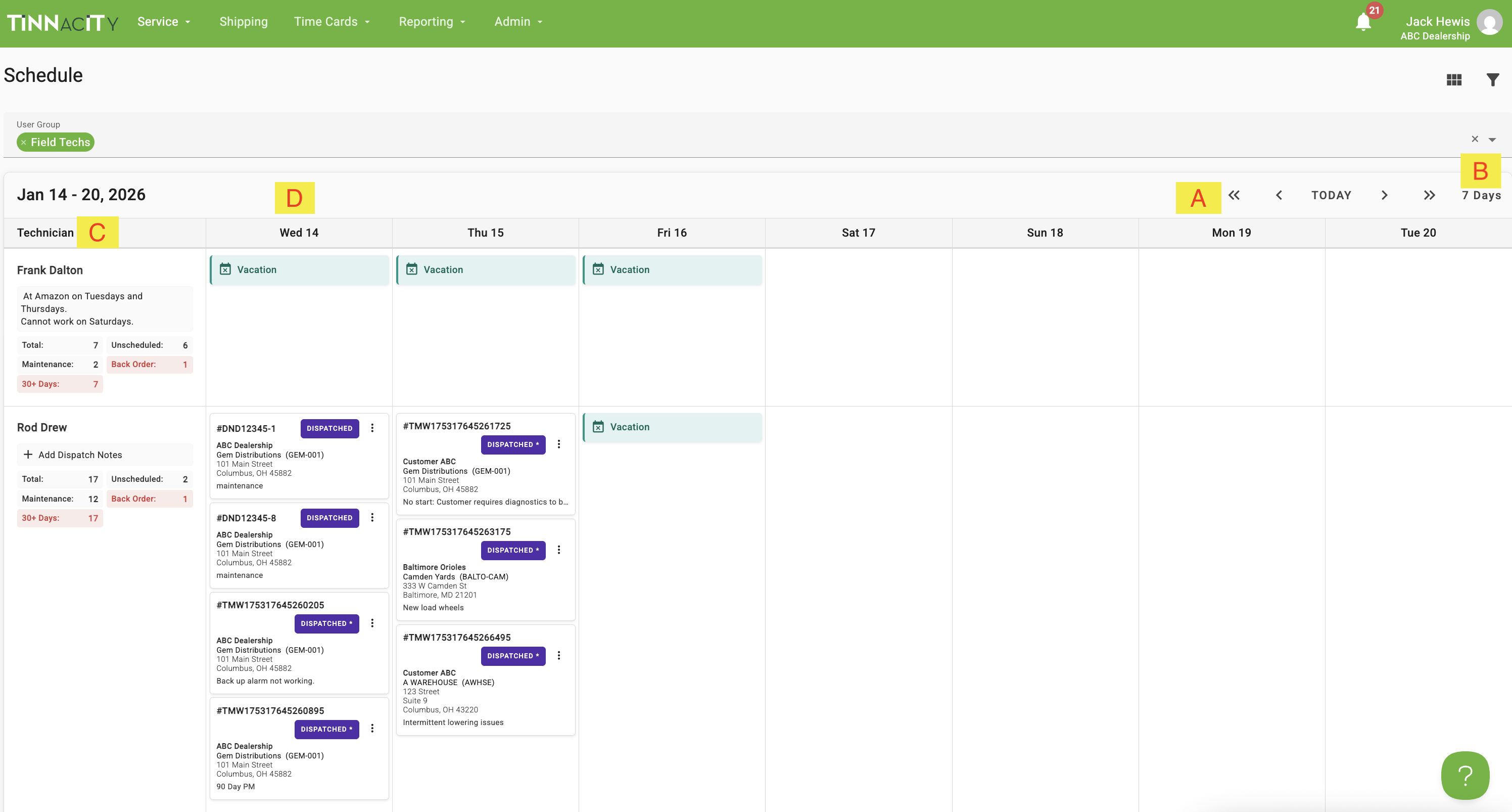 (D) Day of Week: Day of week up to 7 days, here is where you can use the + Schedule Work Order option to schedule the technician's day.