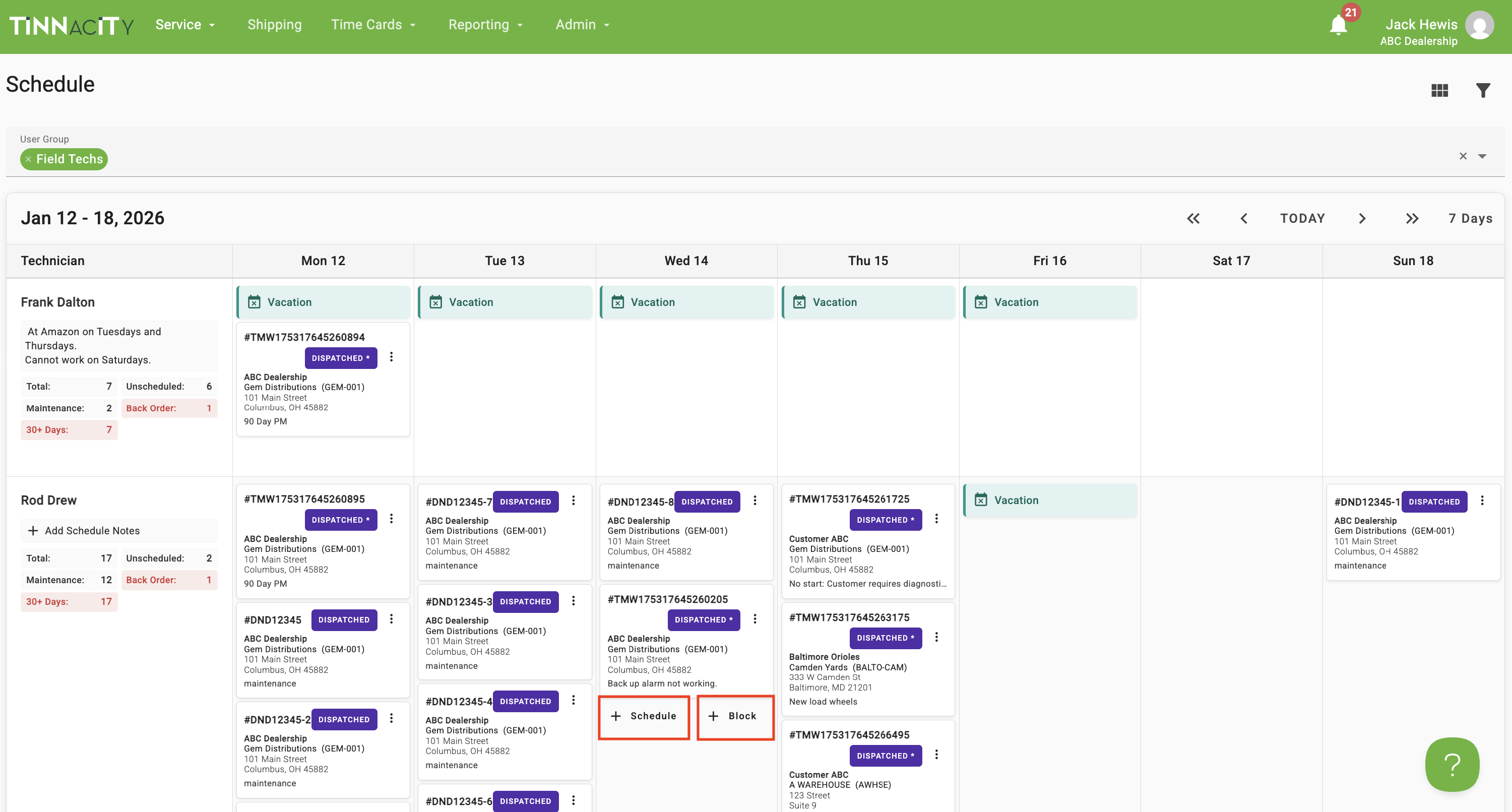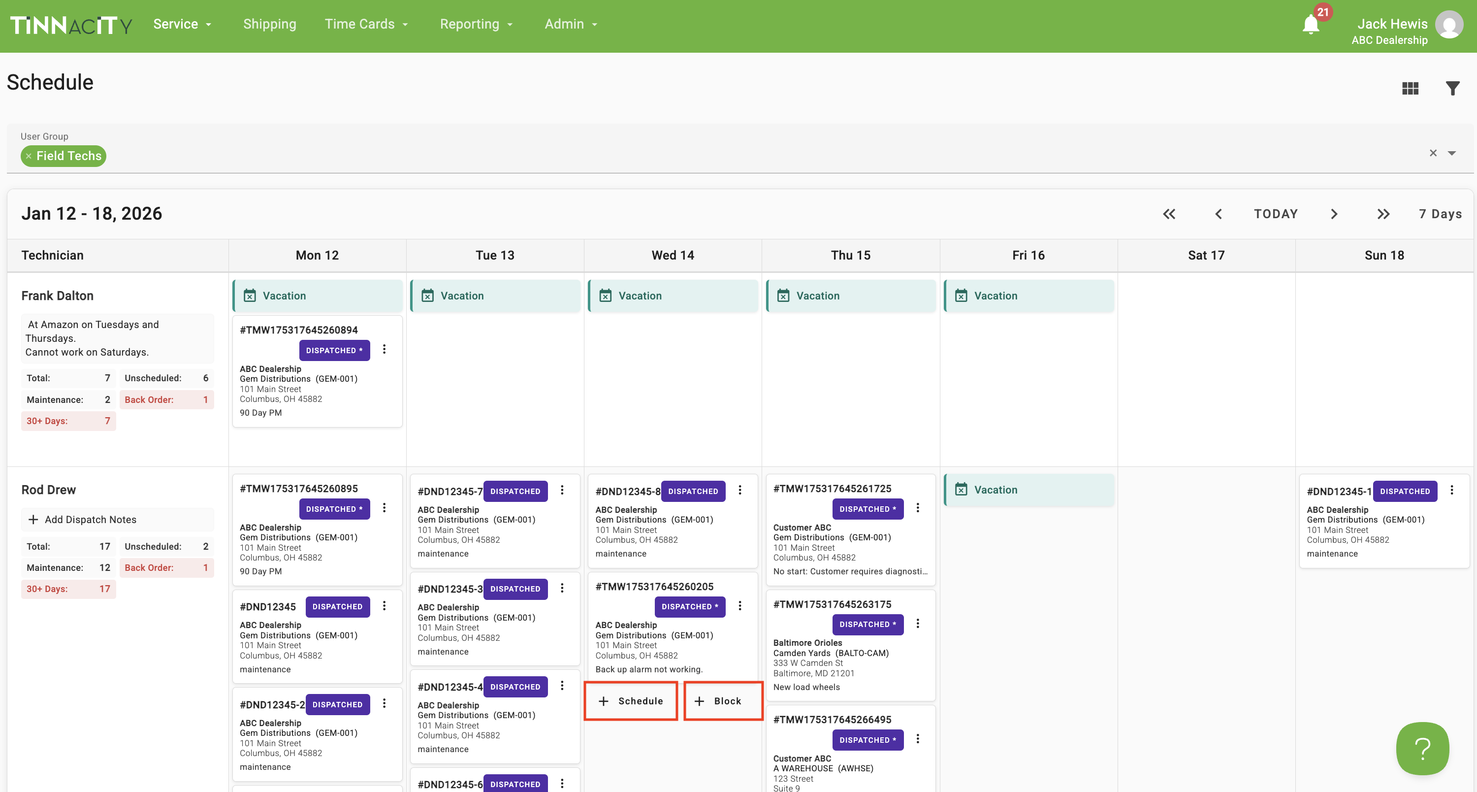 To schedule or block a technician's day, hover the mouse in the desired date card and then click + Schedule Work Order or + Create Schedule Block.