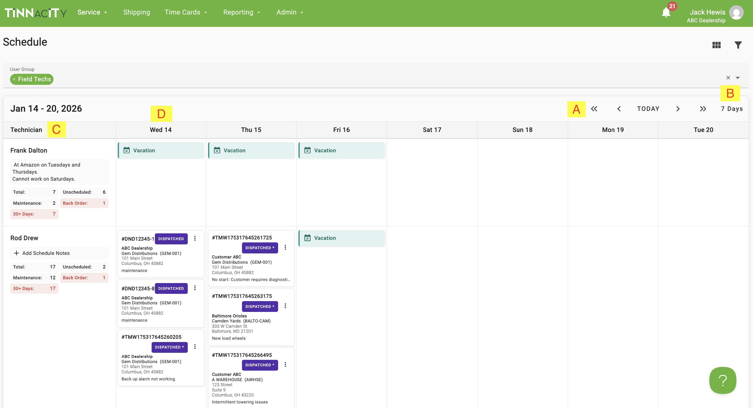 (C) Technician Card: Each technician has a dedicated card that summarizes their current workload and identifies potential bottlenecks. These metrics help dispatchers balance assignments and prioritize aging tasks.