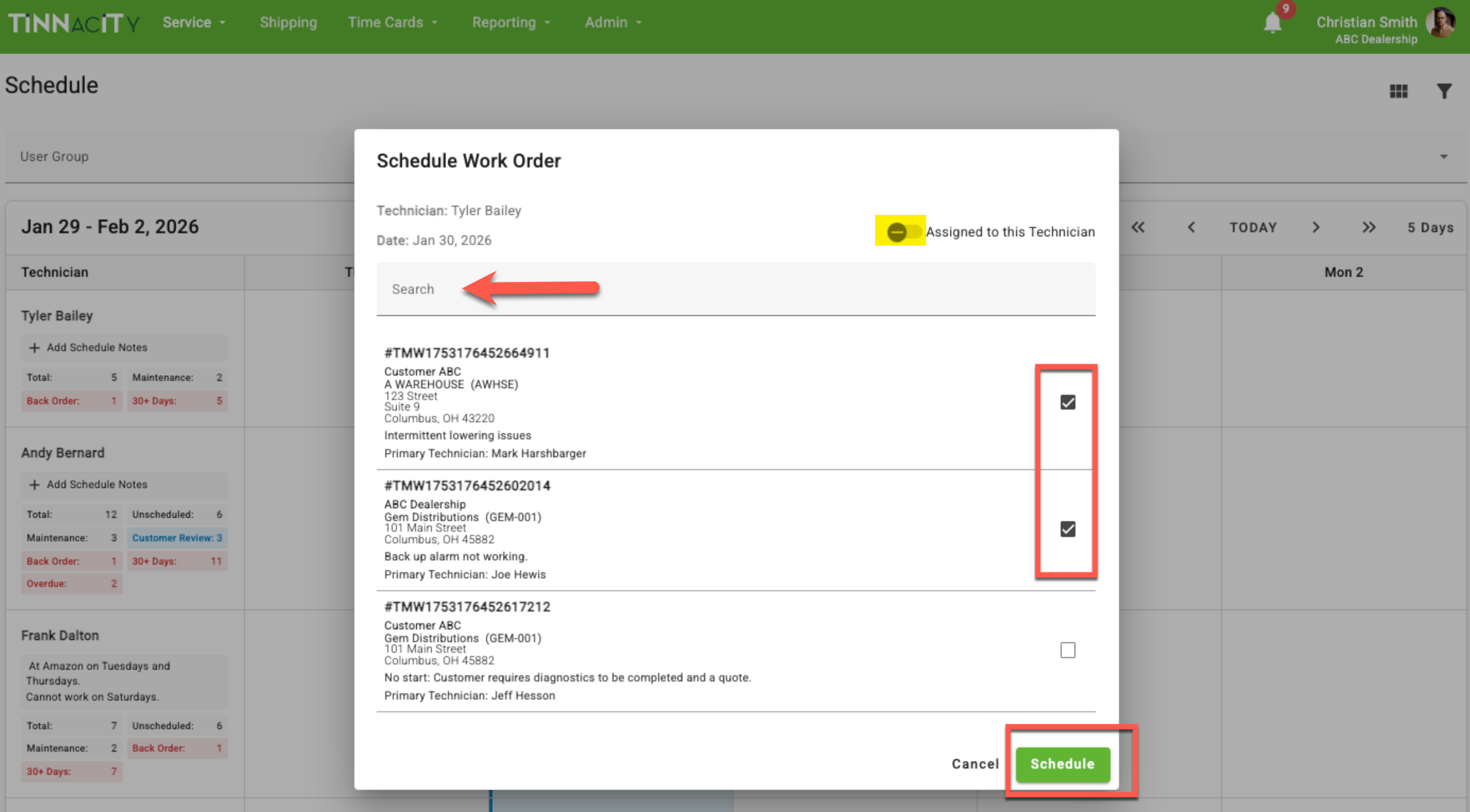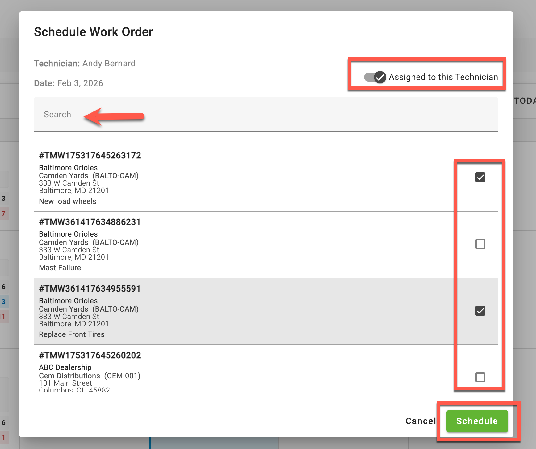 Use the search field to search for a specific work order or scroll through the list to select a work order, then click [Schedule]. NOTE: You do have the ability to schedule multiple work orders at once in this screen.