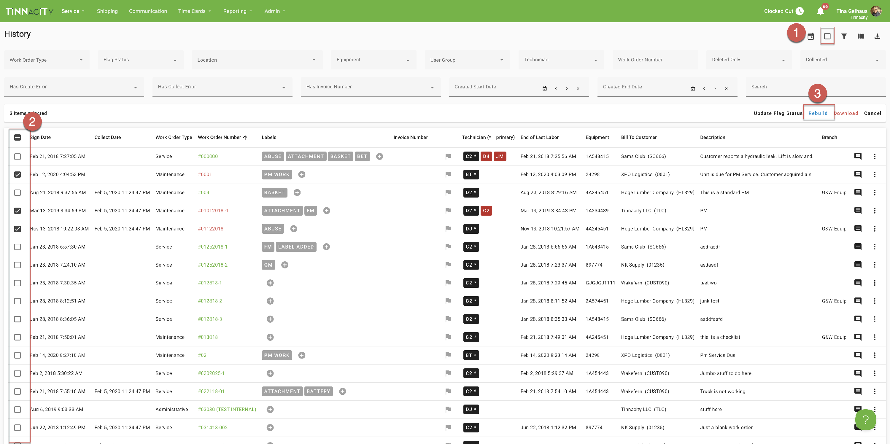 Click Select Multiple Rows icon at the top, right corner, select the work orders that the PDF needs rebuilt, and then click 'Rebuild'.