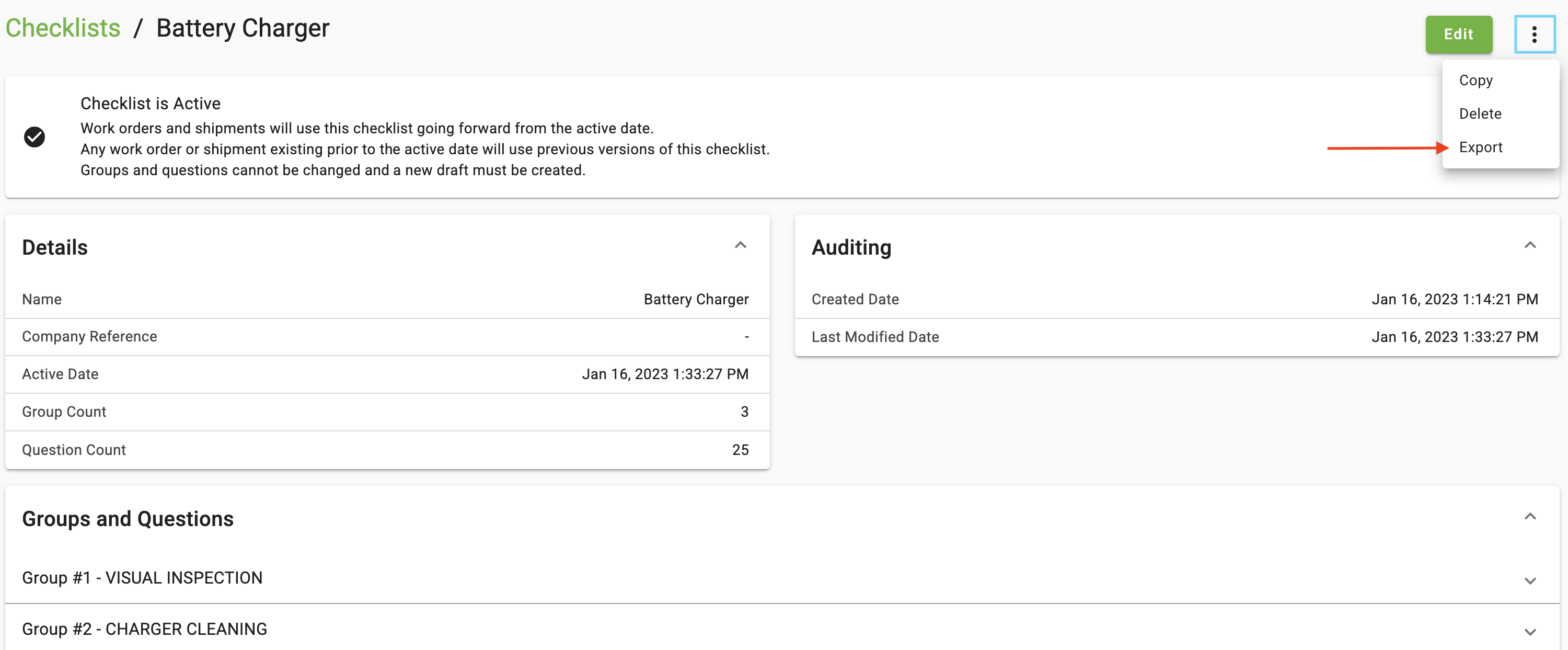 TIP: If you would like to export an existing checklist to a .CSV file, when in the checklist details screen, click the three dots in the top right portion of the screen and select Export.