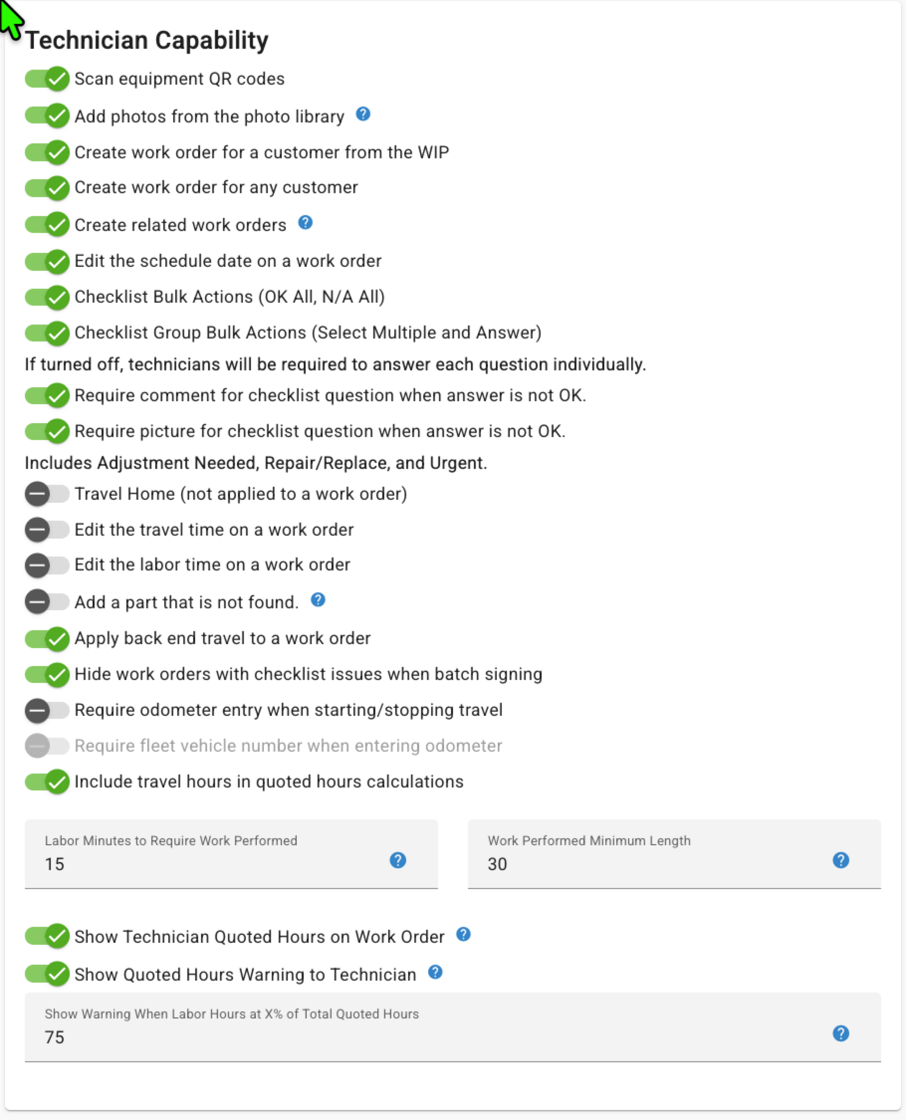 - Show Technician Quoted Hours on Work Order: If this is enabled and a work order has a configured "Quoted Hours', the hours quoted will display to the technician within the work order details.