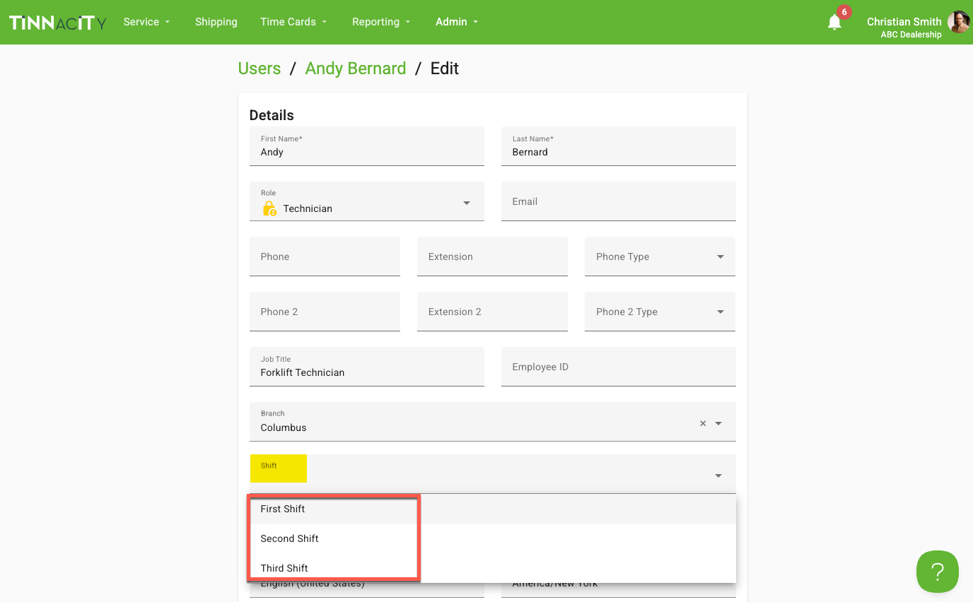 To assign a shift to a technician, navigate to HQ > Admin > Users > technician details screen. Select Edit in the top right corner. Within the details card, in the Shift field, choose from available options in the Shift drop down.