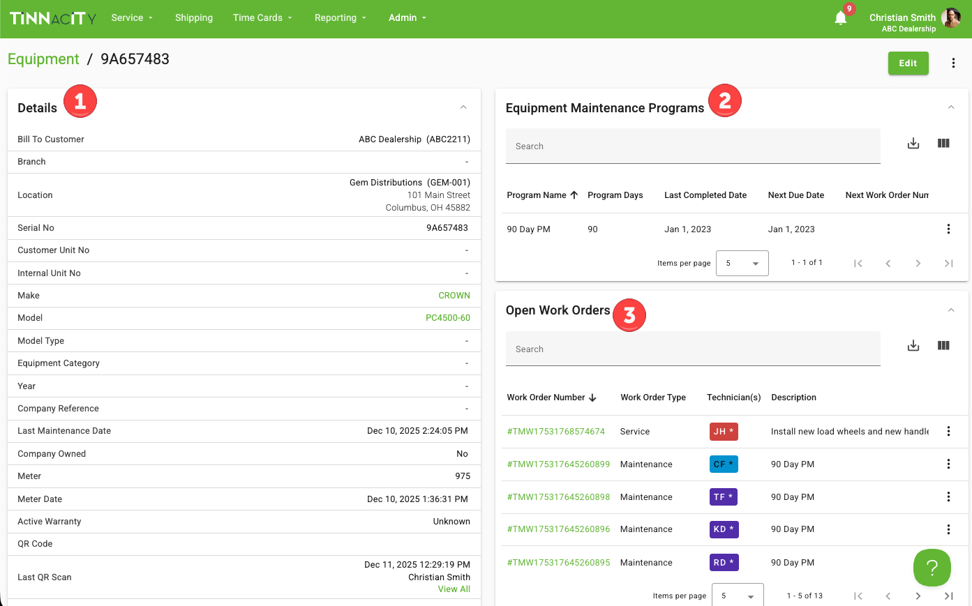 QR Code - Only applicable if your dealership purchased Tinnacity's QR feature and the equipment has an active assigned QR Code. Using QR codes for asset management offers several key benefits: Instant Access to Asset Information: Scanning a QR code provides immediate access to detailed asset information, including specifications, service history, and maintenance schedules. Simplified Service Requests: Technicians or staff can quickly submit service requests directly from the QR code, reducing the time and effort spent locating the asset and manually entering data. Real-Time Updates: QR codes allow users to view open work orders and track ongoing service, ensuring they stay up-to-date on the asset’s current status. Improved Accuracy: By linking directly to an asset’s data, QR codes minimize errors associated with manual entry, leading to more accurate records and reporting. Increased Efficiency: QR codes streamline the asset management process by enabling quick scans for inventory checks, maintenance tracking, and service requests, saving time for technicians and administrators alike.