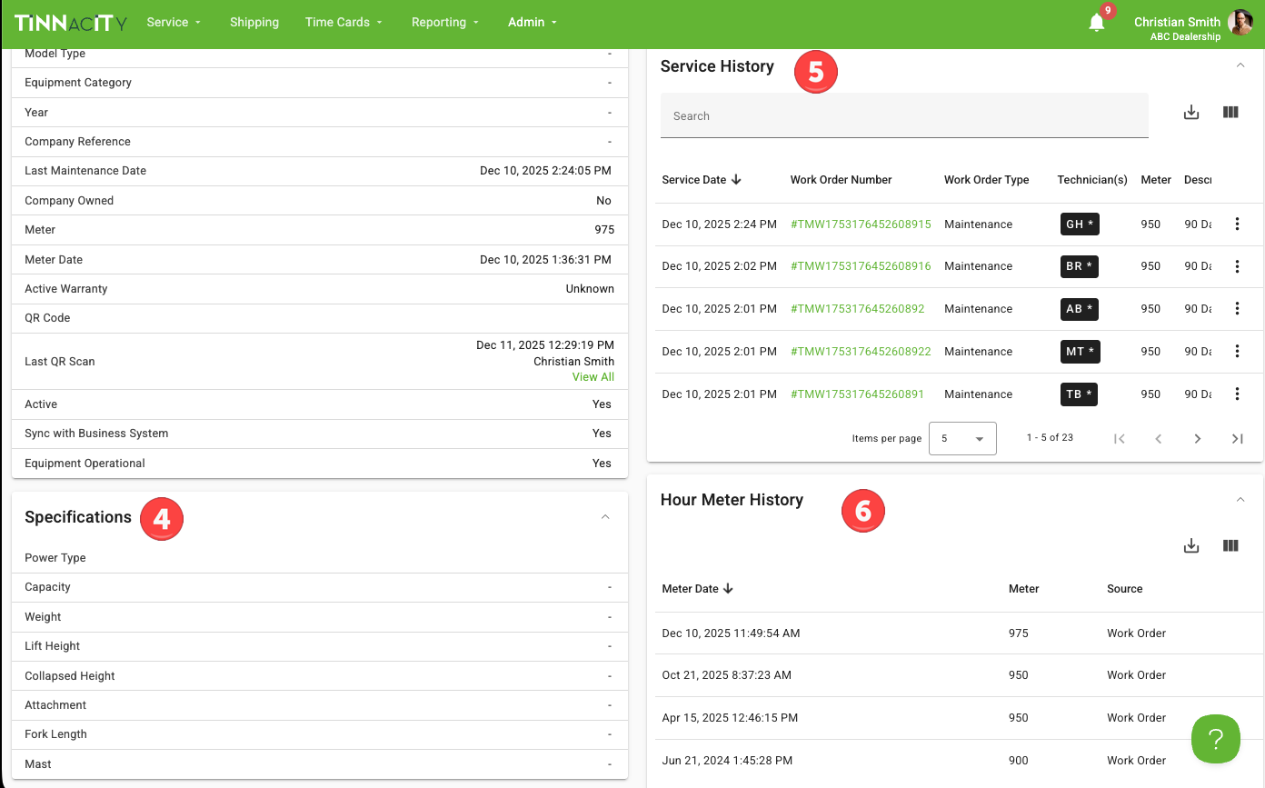 5) Service History Card: View and access all closed work orders for the respective equipment.