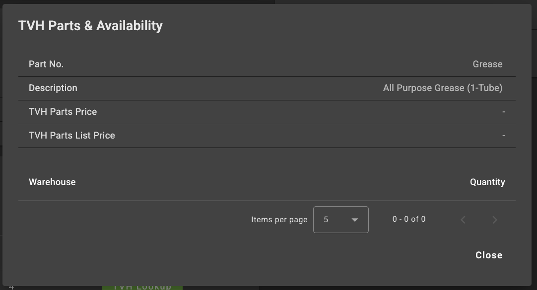 - Lookup any TVH part for price and availability within a part request. Button for "TVH Lookup" will be present on each part line within the request.