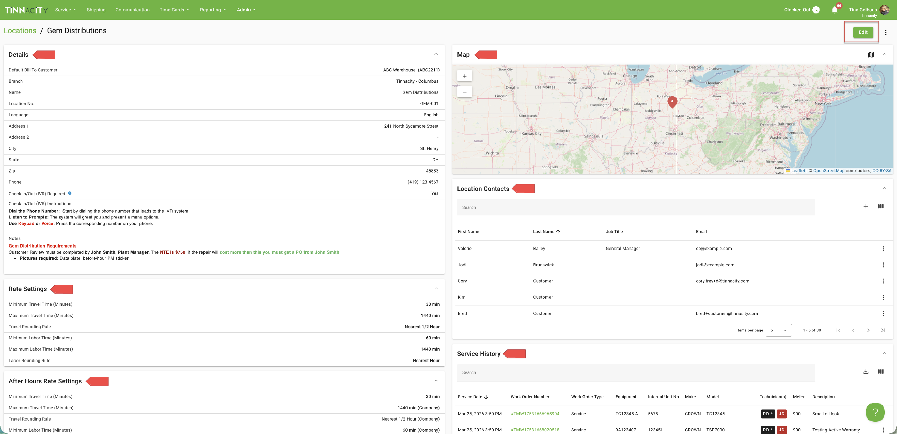 - Rate Settings: Overrides the default work order type billing rates for this specific location.