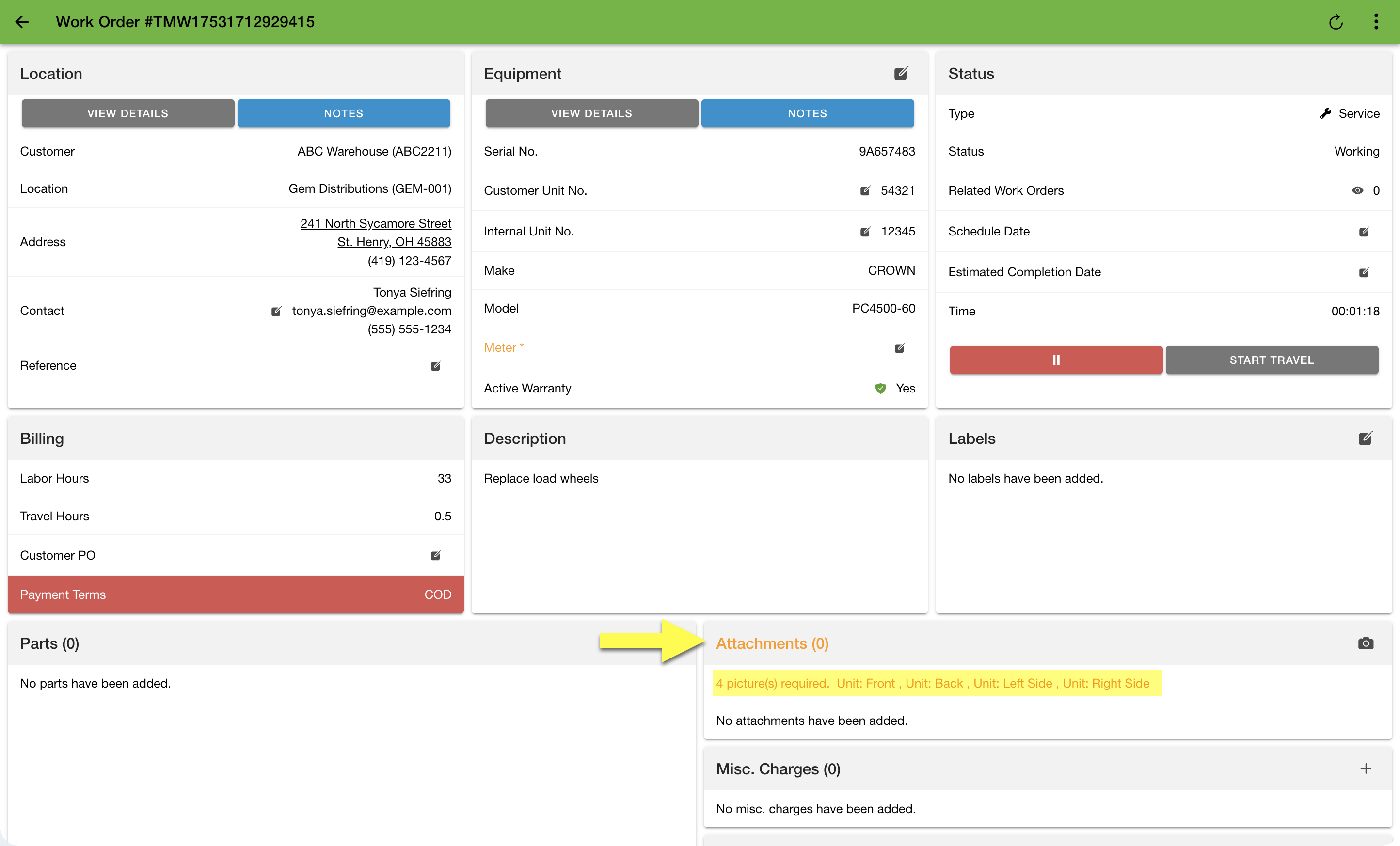 If the Work Order Type requires specific documentation, the Attachments card will list the mandatory count and provide the necessary labels for compliance.