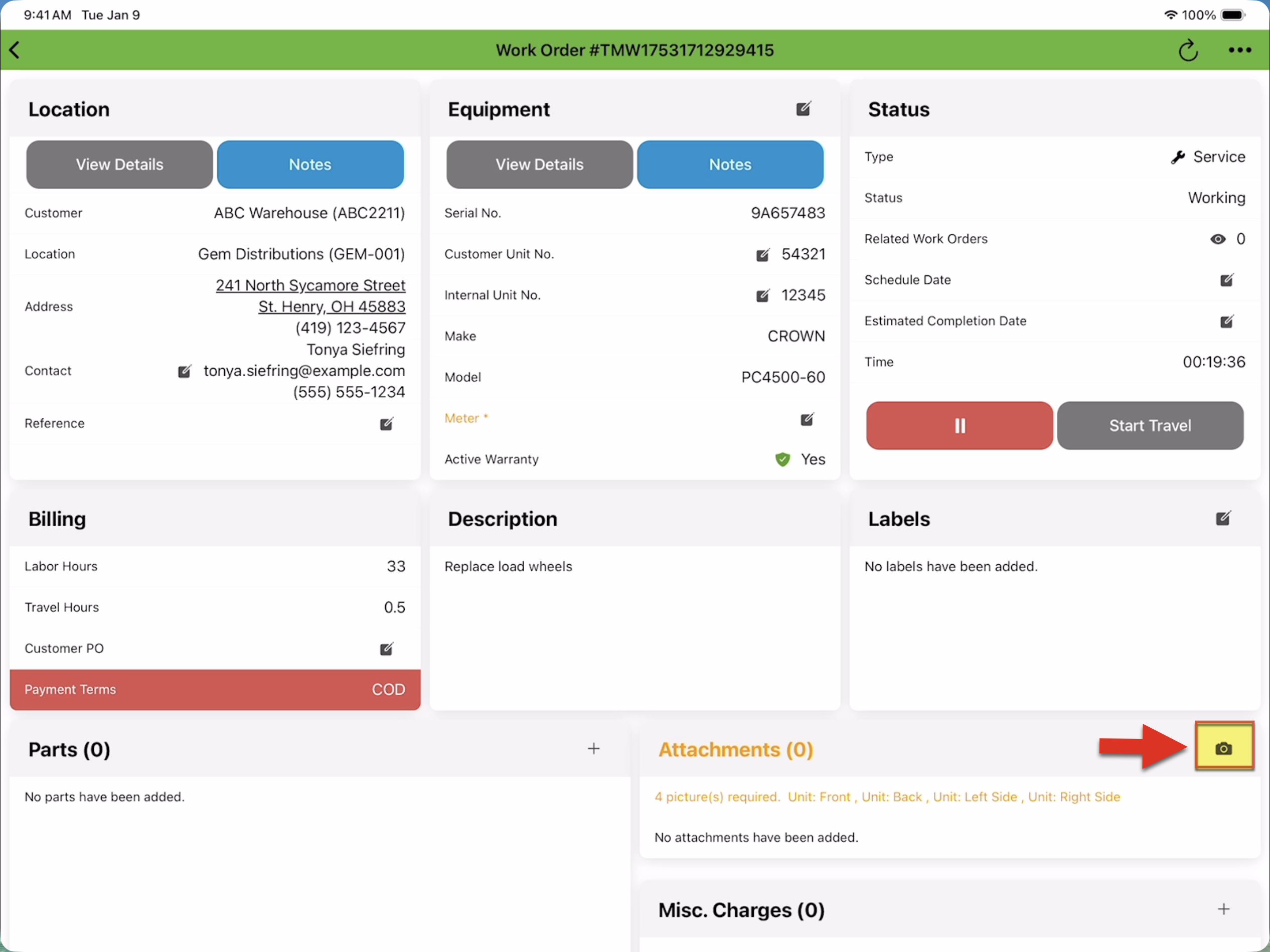 To maintain a clean service history, distinguish between transactional and permanent attachments. Work Order attachments should focus on the current repair—specifically capturing the state of the equipment and components before and after service.