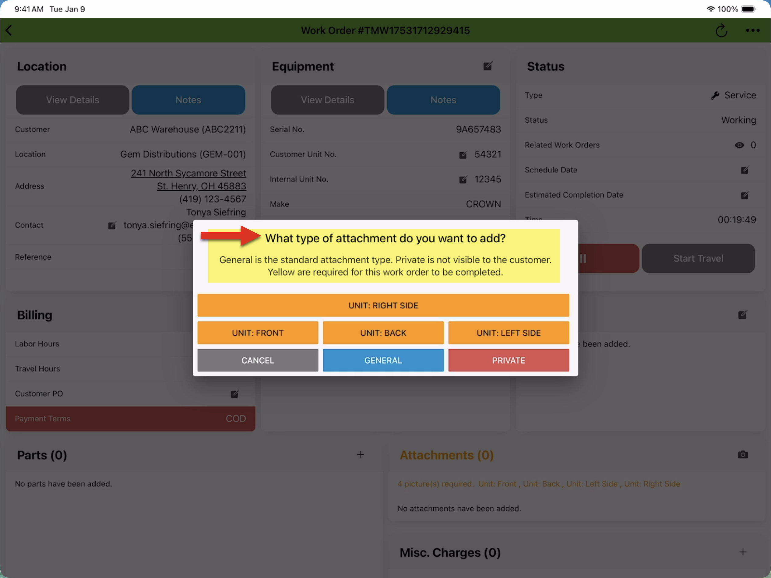 If the Work Order Type has required picture count and labels, each required picture will have a [button] (e.g., UNIT: RIGHT SIDE, UNIT: FRONT, etc.). Tap which picture you want to capture. NOTE: [GENERAL] allows you to take additional photos and/or video that are visible to the customer. [PRIVATE] allows you to take a picture and/or video that is only visible to technicians and the back-office (not to the customer).