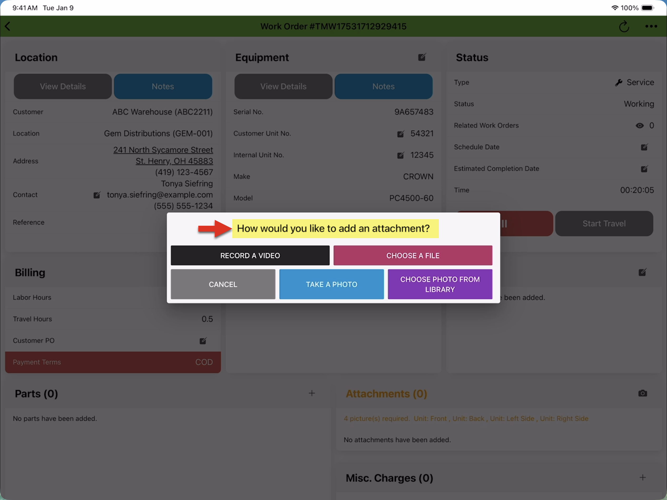 - Choose Photo from Library: In enabled, this option allows you to upload a photo(s) from your photo library. This option should only be used if a photo was taken outside of the Service app and marked up to indicate "see here" (e.g., arrow, circled section, etc).