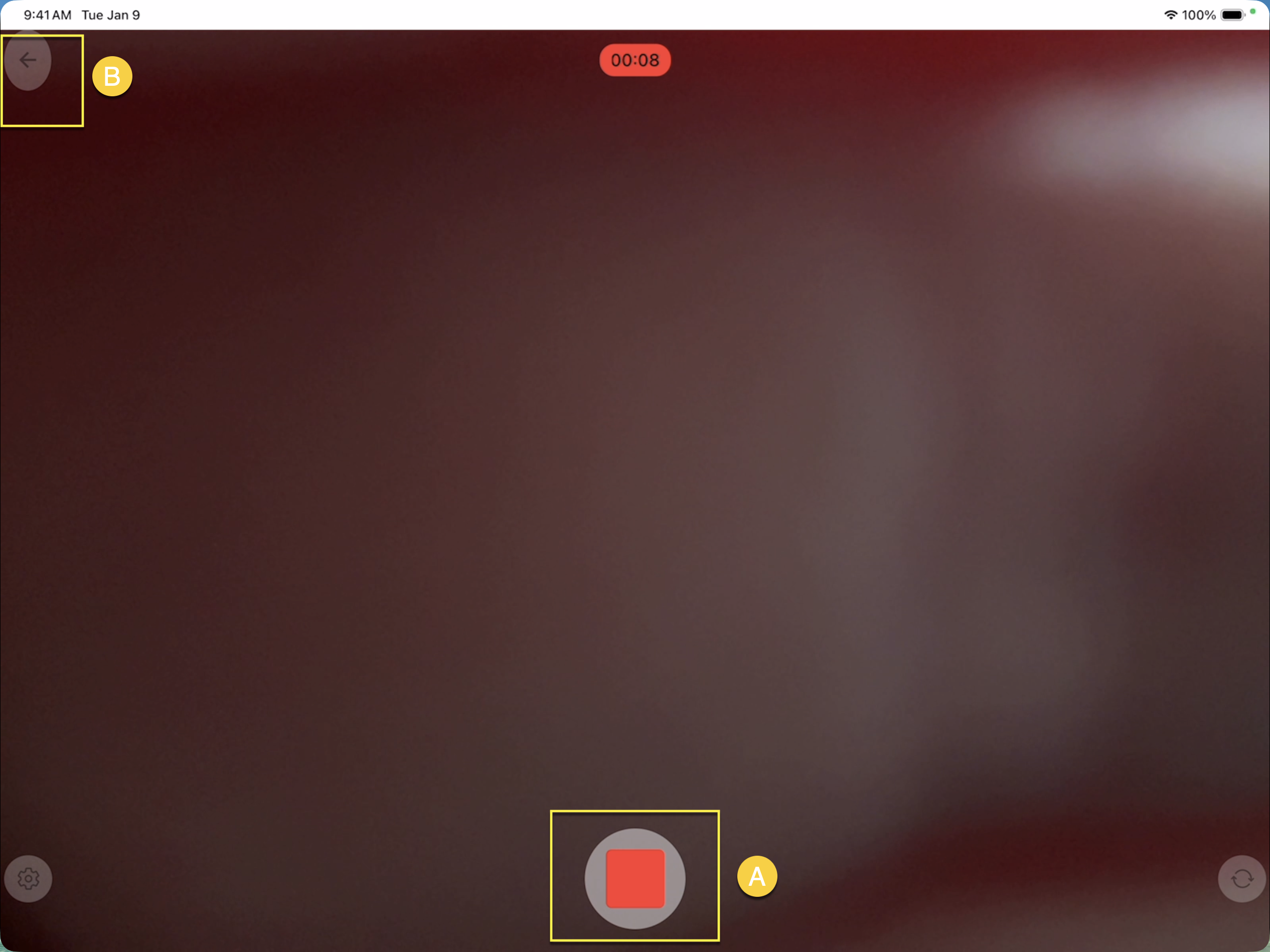Up to 15 seconds of video can be recorded per recording. Press (A) stop recording to stop the recording, then press the (B) back arrow to attached the recording to the work order. NOTE: If 15 seconds is reached, the recording will automatically stop and attach to the work order.