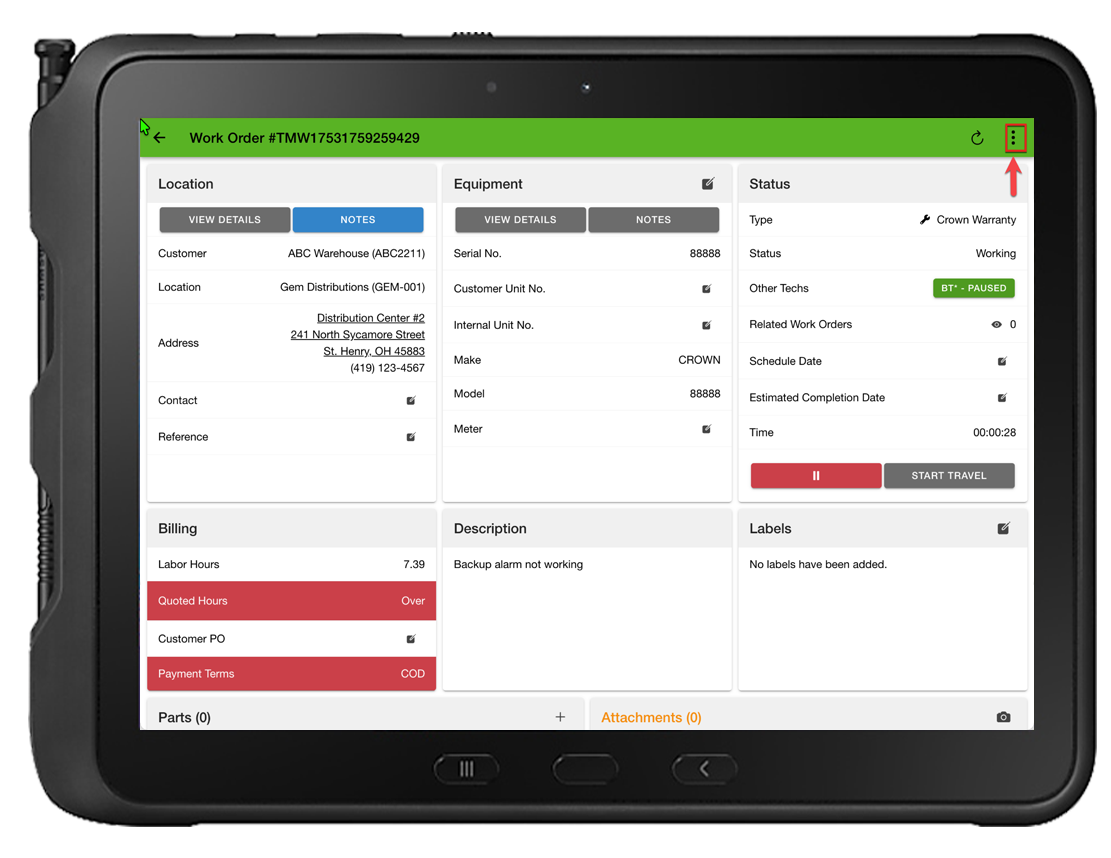 The status card displays what type of work order (i.e., Service, Maintenance, Warranty, etc.), the Status the work order is currently in (i.e. Traveling, Working, Paused, etc.), Due Date (if set), Schedule Date (if set), Priority (if set) and Estimated Completion Date (back office and technicians can modify this date), and the current allotted time towards the selected action. Click here to learn how to sort open work orders by priority, schedule date, etc.