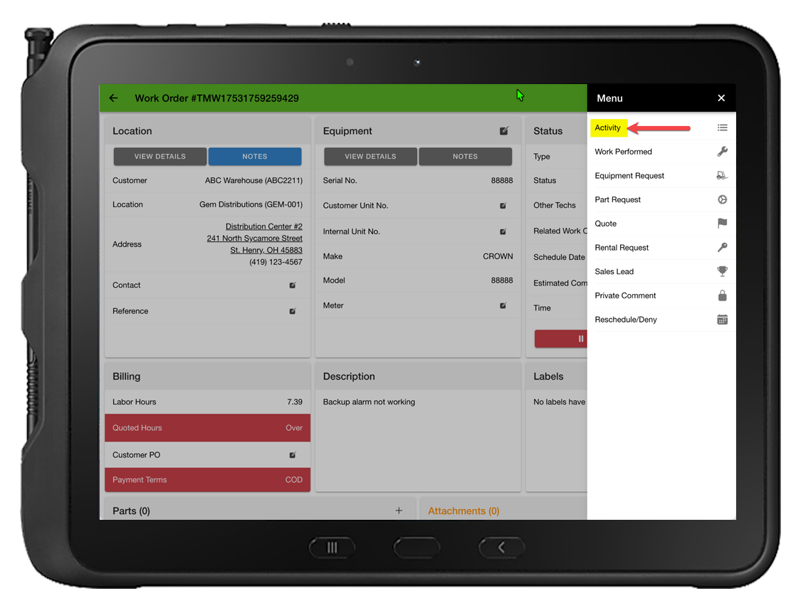 The 'Activity' option provides technicians with a comprehensive, real-time log of everything happening on a work order.