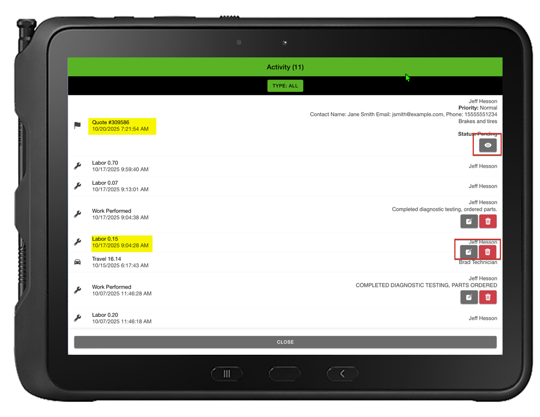 Technicians can easily view all completed actions, including submitted quotes, part requests, applied labor/travel hours, work performed notes, etc. More importantly, the Activity screen is where technicians can take action: