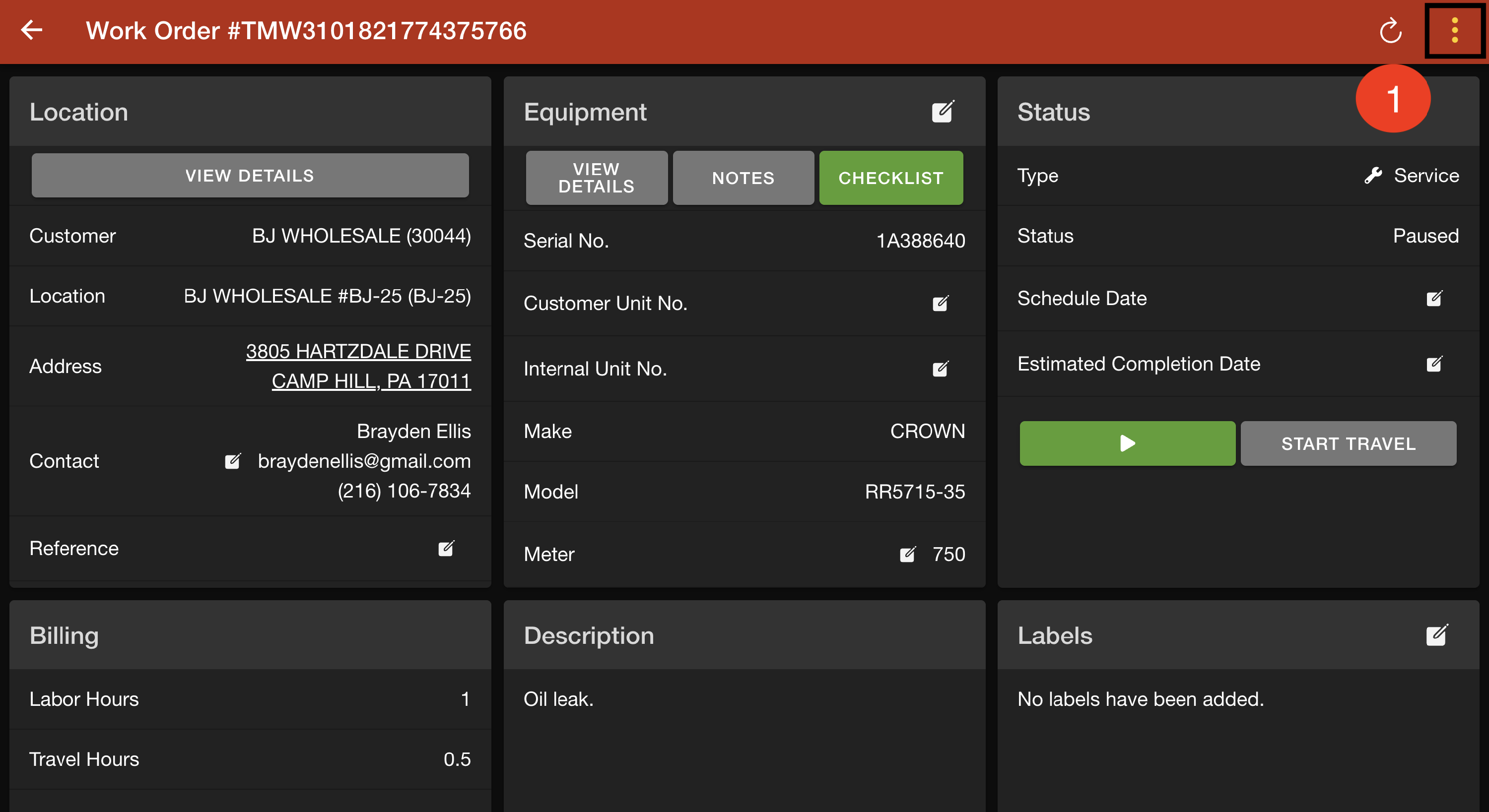 - Within the Work Order Details screen on the top right, select the 3 dots.