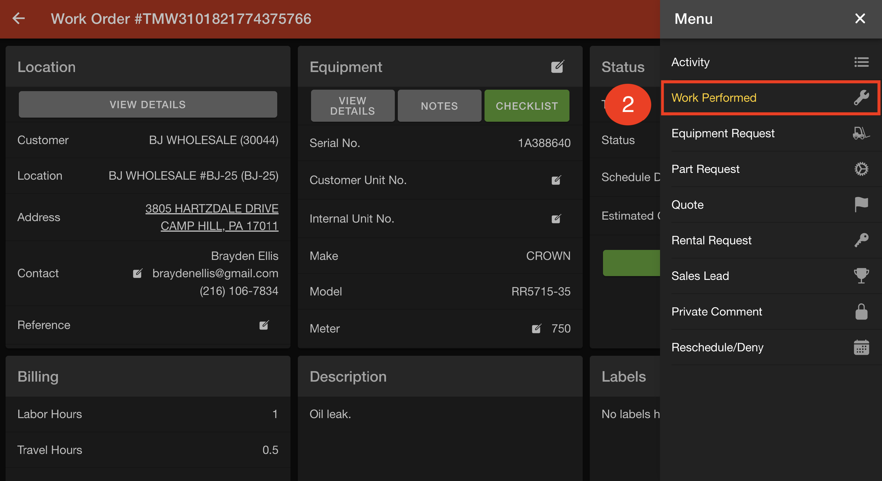 - From here select Work Performed. The Technician can then enter their work performed comments.