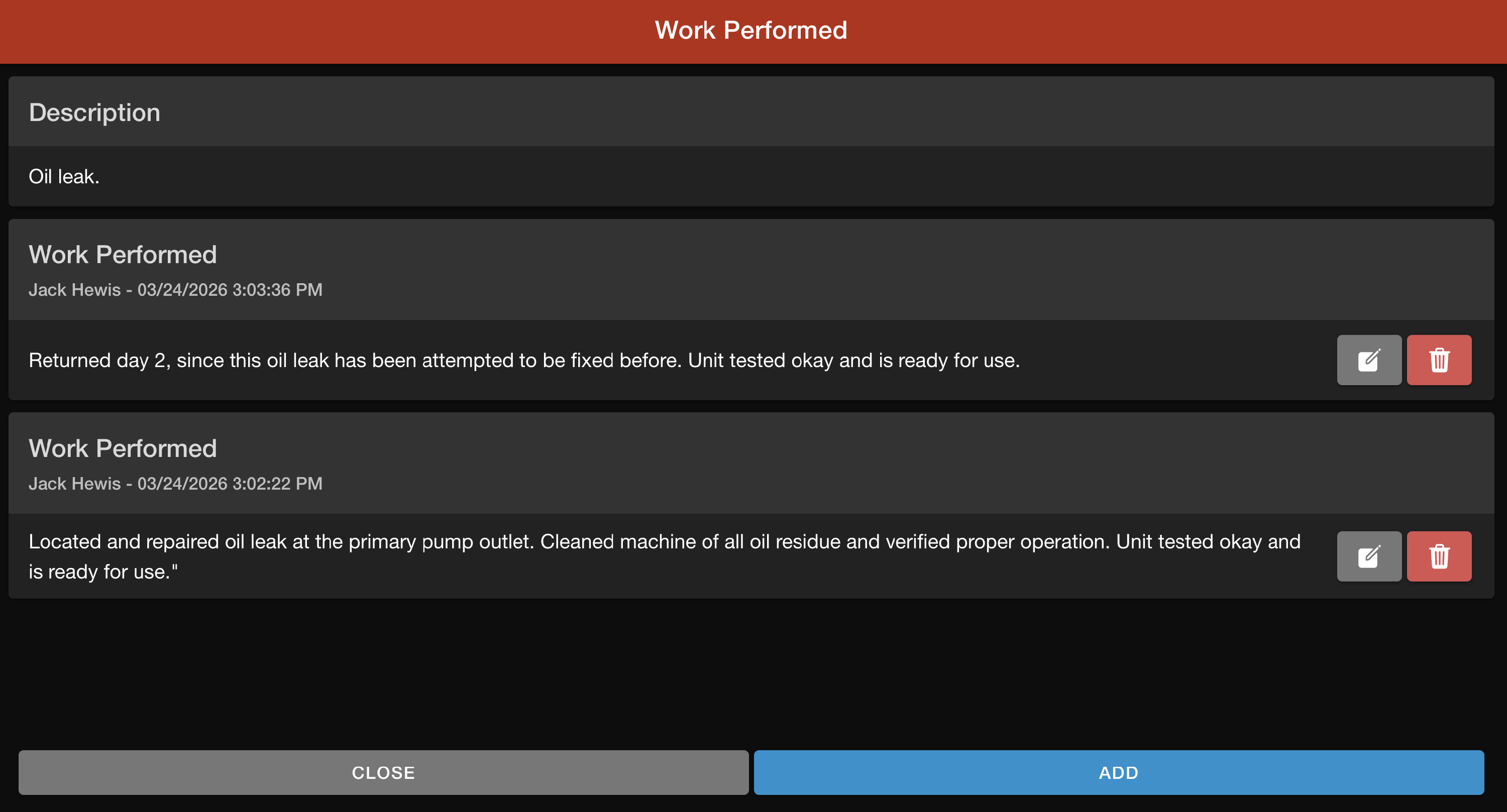 The Technician can add multiple days worth of comments within this screen and has the ability to edit/delete comments.