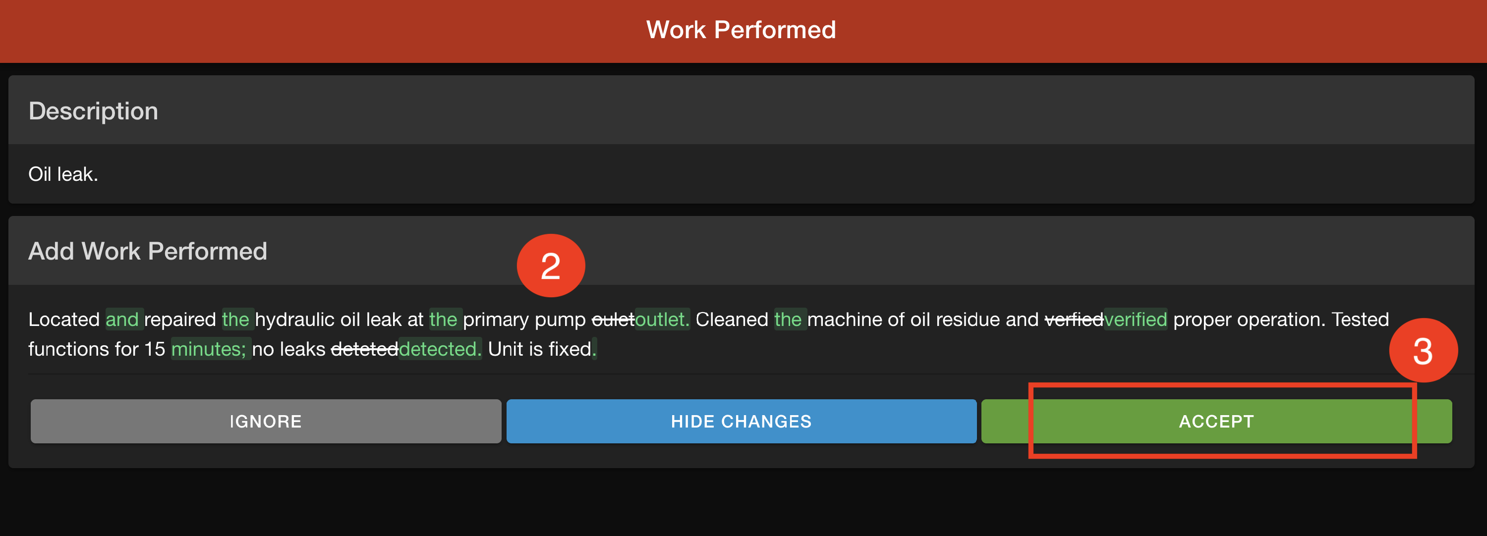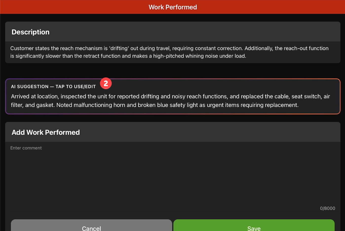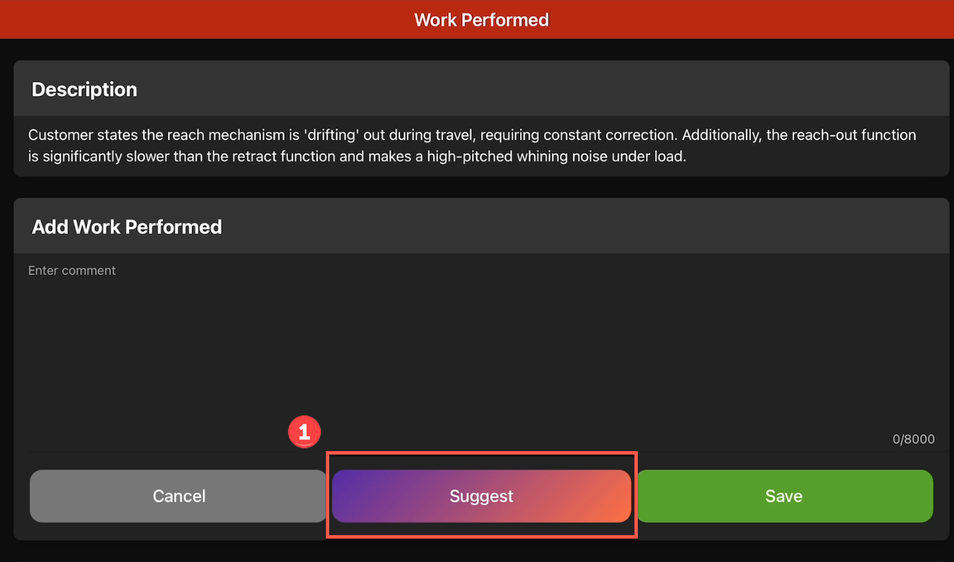 - Press the Suggest button within the work performed comment screen. This will allow an AI-drafted comment suggestion that the technician can accept, edit or ignore.