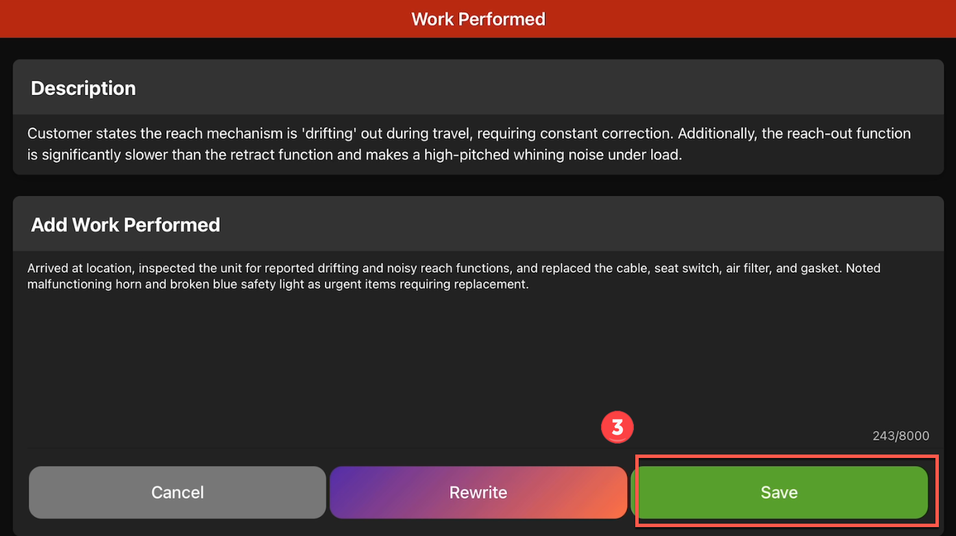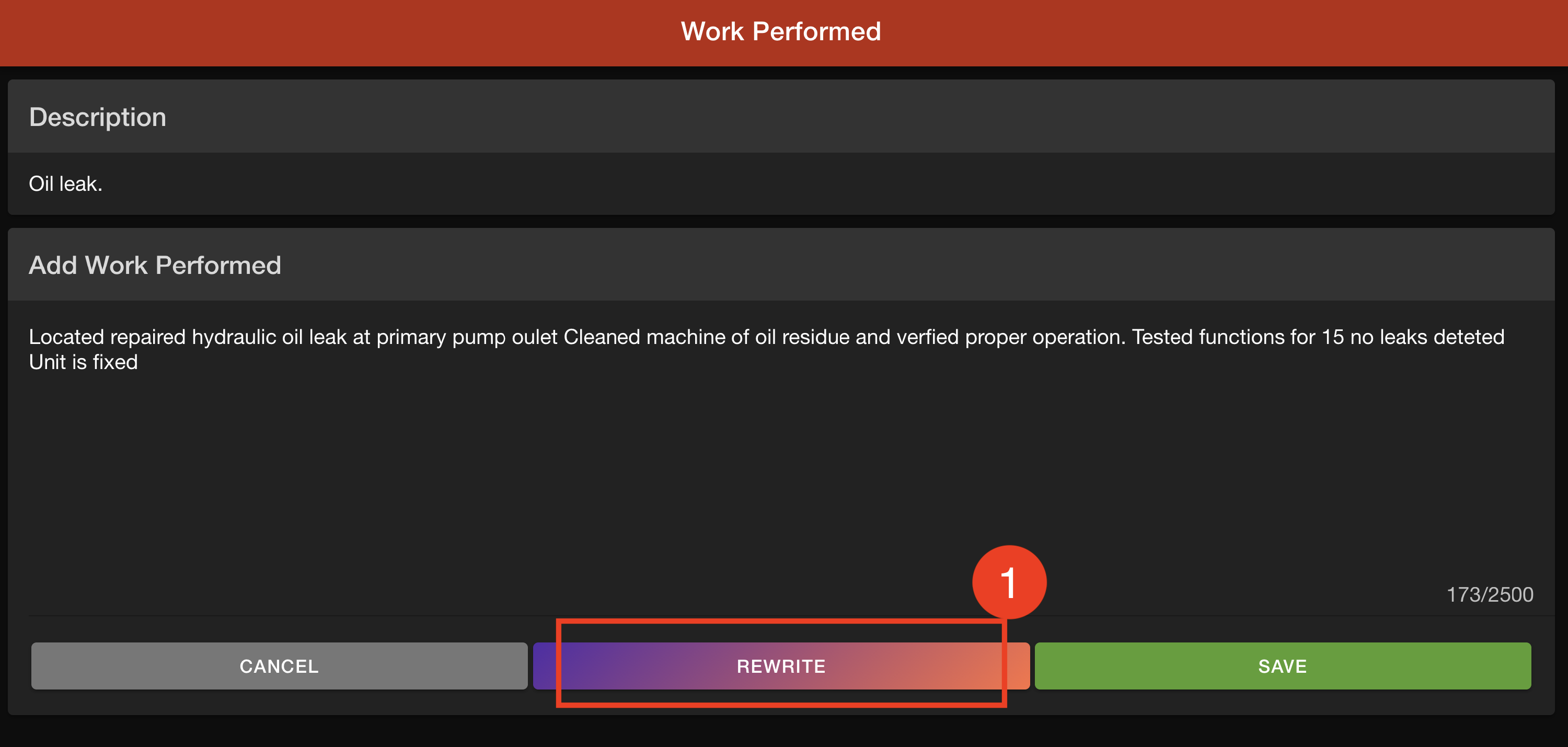 After entering a comment, technicians can also select the Rewrite button, which provides AI Rewrite suggestions. The following steps provide instructions on how to use this feature: