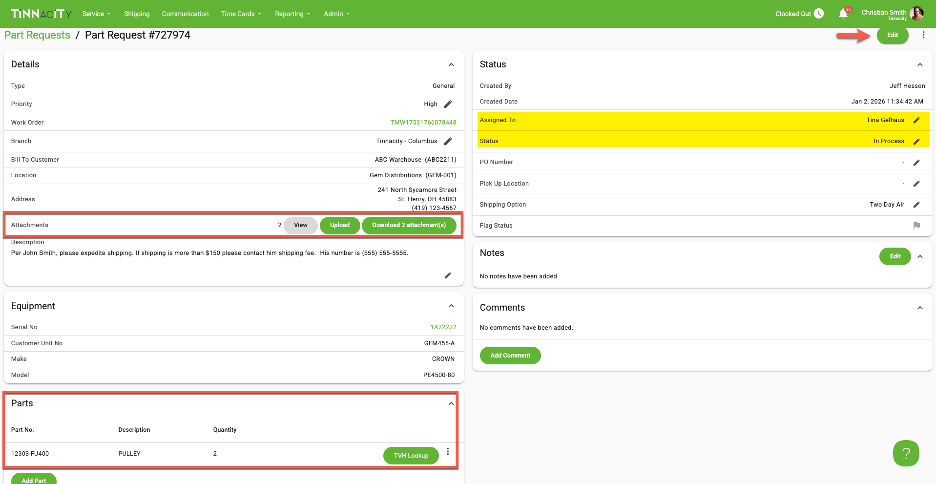 In HQ Service>Part Requests, a Parts Personnel takes ownership of the request and updates the status to In Process and begins researching the request. During your research, remember to use the Notes and Comments features to communicate with your back-office and technicians. TIP: A part request CAN be edited by an HQ user, if needed. To edit a part request, click on the Edit button in the top right corner of the part request details screen to edit the: Request Type, Priority, Location, Work Order, Bill To Customer or Description.